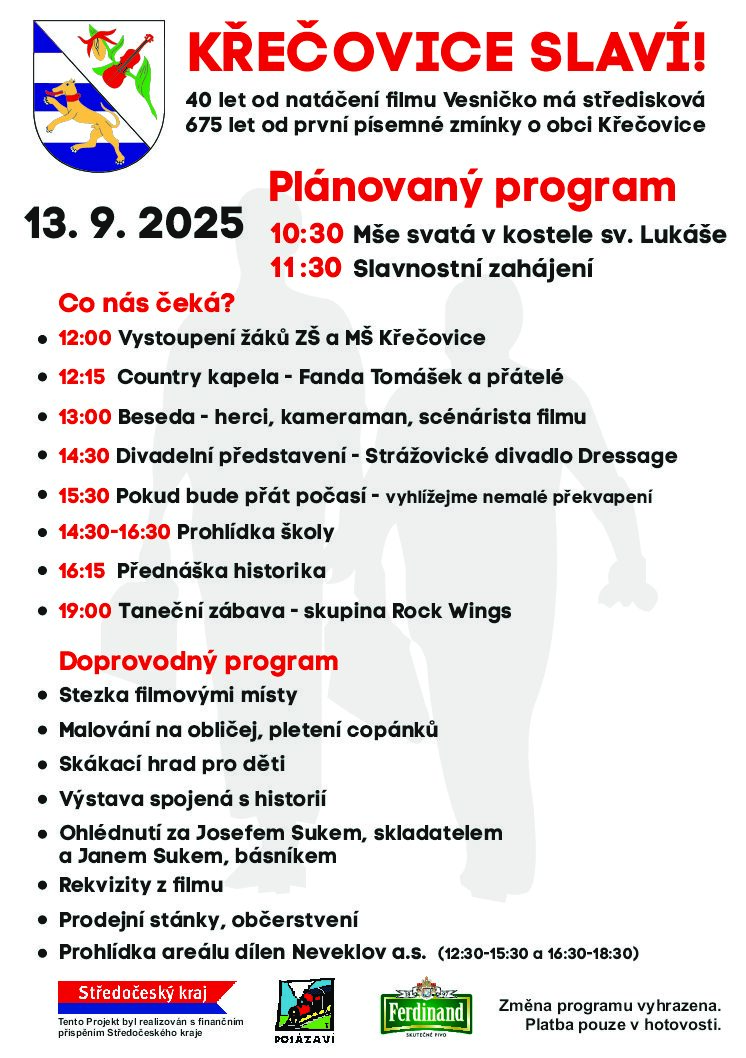 Zveme všechny na přátelské setkání ku příležitosti výročí 40 let od natáčení filmu Vesničko má středisková a 675 let od první písemné zmínky o obci Křečovice pozvánka https://fandatomasekapratele.cz/wp-content/uploads/2025/08/KRESOVICE-PLAKAT.pdf